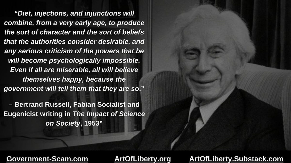 “Diet, injections, and injunctions will combine, from a very early age, to produce the sort of character and the sort of beliefs that the authorities considerdesirable, and any serious criticism of the powers that be will become psychologically impossible. Even if all are miserable, all will believe themselves happy, because the government will tell them that they are so.” – Bertrand Russell, Fabian Socialist and Eugenicist writing in The Impact of Science on Society, 1953.