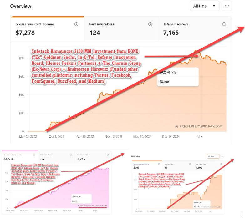 I was on The Last American Vagabond and Conscious Resistance Telethon/Fundraiser with a variety of other liberty-oriented content creators and shared some slides (below) showing that that right before Substack Announced their $100 MM Investment from BOND (”Ex”-Goldman Sachs, In-Q-Tel, Defense Innovation Board, Kleiner Perkins Partners) + The Chernin Group (Ex-News Corp) + Andreessen Horowitz (Funded other controlled platforms including Twitter, Facebook, FourSquare, BuzzFeed, and Medium), our growth on Substack, which had been growing significantly…
